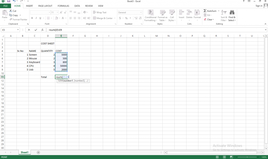 Now enter the data by making fields like cost, quantity and name and for total cost write sum and select the cost field by pressing shift+field.