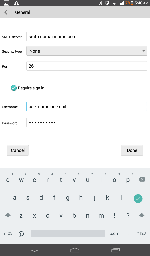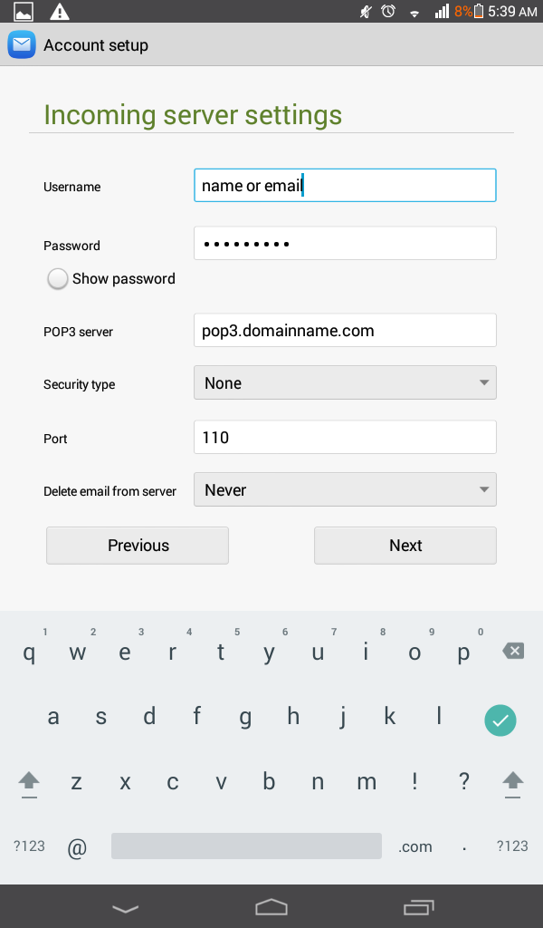 Enter your user name, password, in POP3 server option enter your domain name and port 110.